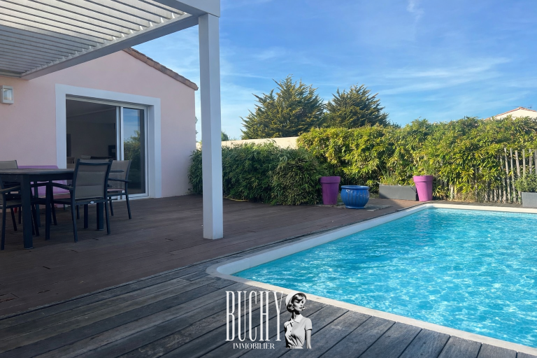 La Maison BUCHY vous propose idéalement située dans un environnement calme, à proximité des commerces et à moins de 2km de la plage, cette maison entièrement de plain-pied qui se distingue par sa clarté et son agencement généreux. Le salon s'ouvre sur l'extérieur grâce à de larges ouvertures, permettant de profiter pleinement de vue sur la piscine. Vous apprécierez a pergola bioclimatique très utile et confortable.